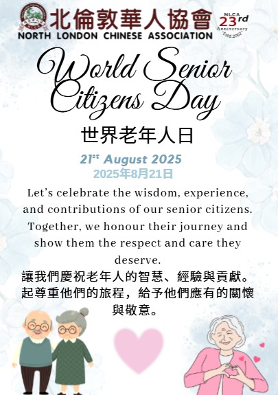Categories News World Senior Citizens Day Post author By nlcawebsite Post date 21 August 2025 ← Experience the 2025 London Chinese Music Festival – concerts, summer school, masterclasses & more with top artists from China & the UK. → Mid Autumn Festival 2025